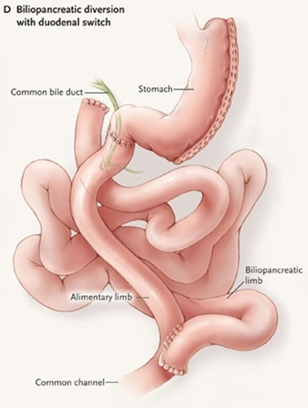 - Biliopancreatic diversion with duodenal switch. Pada prosedur ini, hampir sebagian besar dari lambung dibuang. Cara ini menawarkan turun berat badan yang stabil dan terus menerus. Tetapi cara ini beresiko besar kurangnya nutrisi dan vitamin yang dibutuhkan tubuh. Prosedur ini membutuhkan pengawasan extra ketat untuk memantau perubahan kesehatan yang bisa terjadi. Cara ini digunakan untuk orang dengan BMI 50 atau lebih.